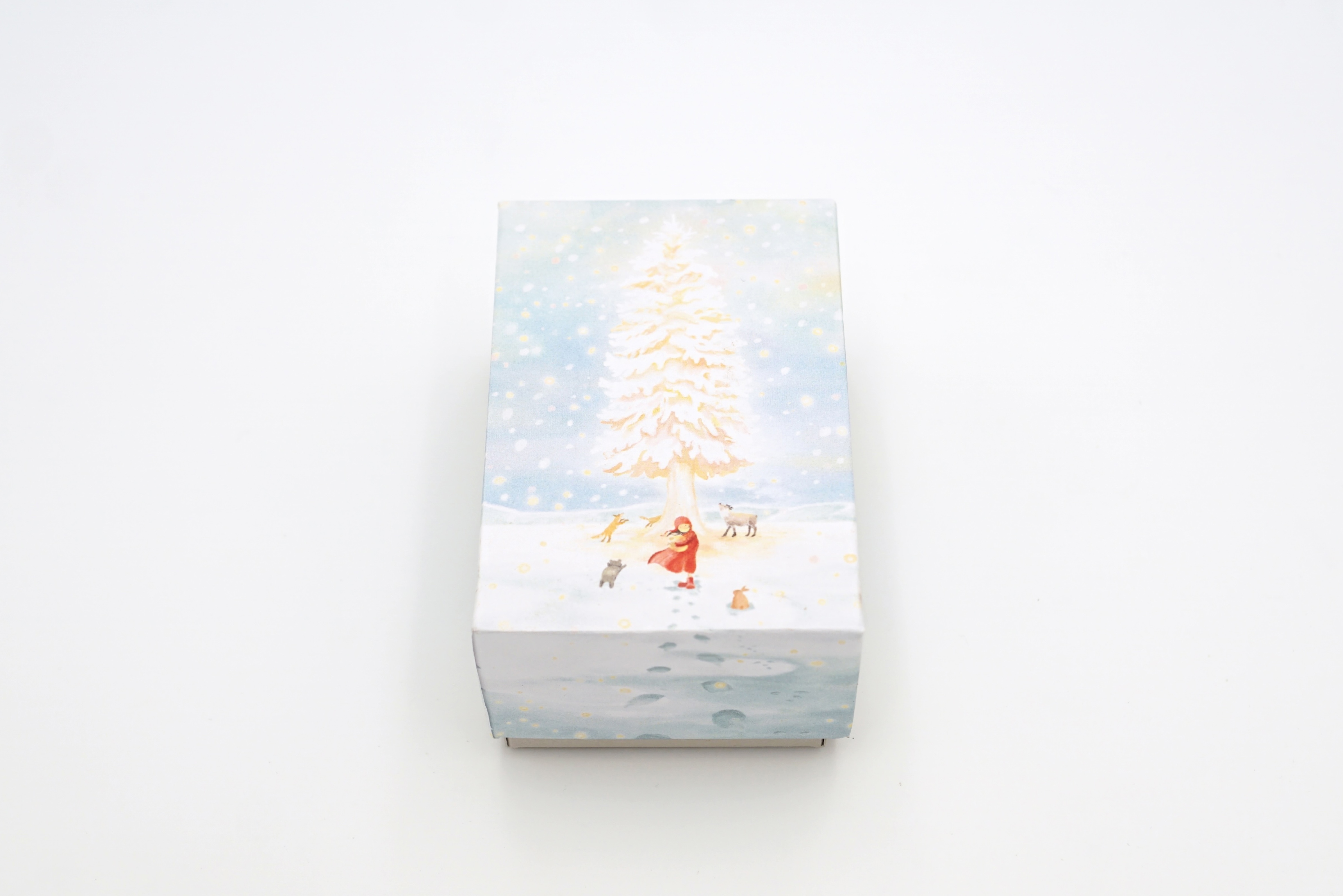 安塚の“雪の森”をイメージして仕立てた、オリジナルデザインの化粧箱に入れてお届けします。箱に描かれているのは、冬の里山でひっそりと暮らす動物たちと、小さな妖精の女の子が登場する物語です。